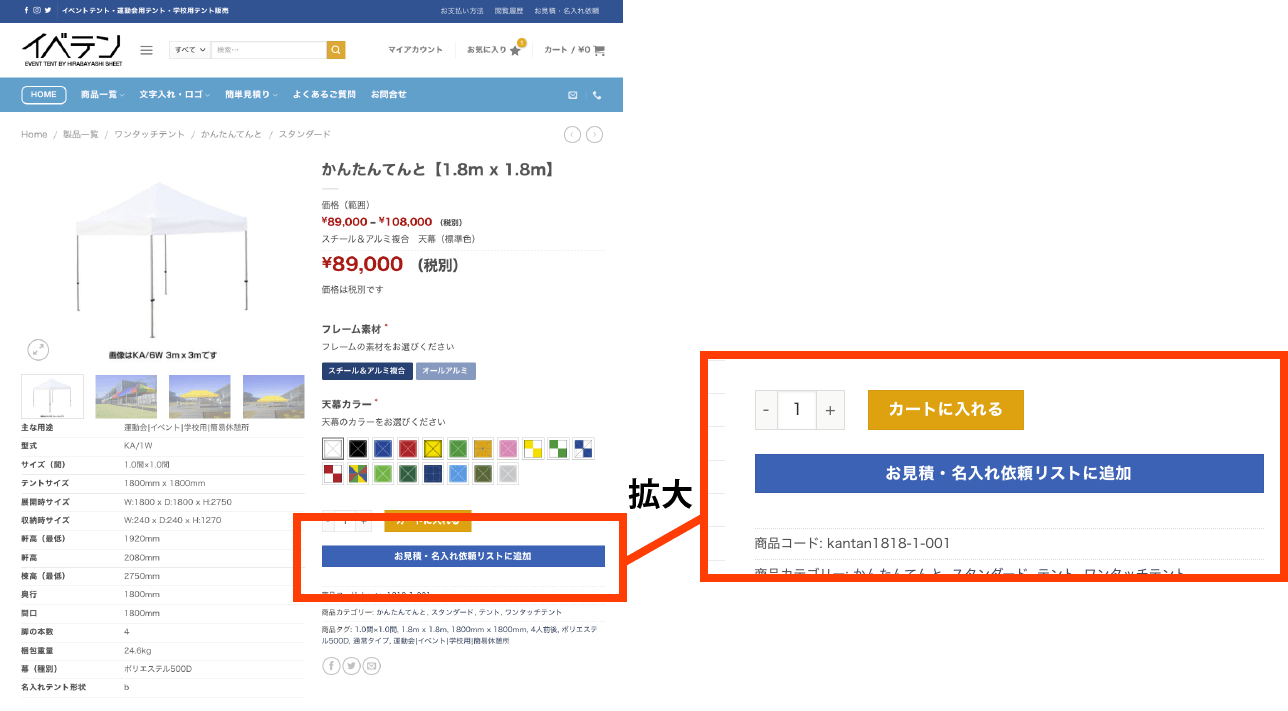 名入れしたい商品を選び、商品詳細ページの「カートに入れる」ボタンの下にある、お見積・名入れを依頼ボタンをクリックします。