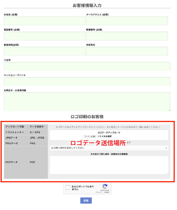 ロゴ印刷希望の方は、ロゴデータ送付場所にある、ファイル選択ボタンをクリックして、ロゴデータを選択してください。