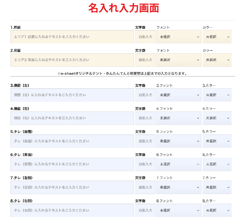 その下にある、名入れ情報入力フォームに、名入れ場所の指示画像にを見て、名入れ可能な場所に名入れをしてください。