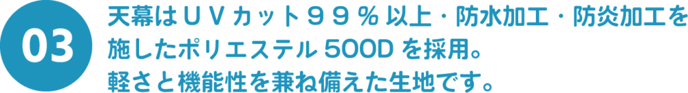 UVカット99%以上・防水加工・防炎加工を施したポリエステル500Dを採用。