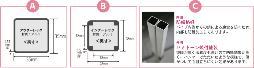 | 支柱 | アルミパイプ35mm角 1.75mm厚(アルマイトコーティング処理) | |
